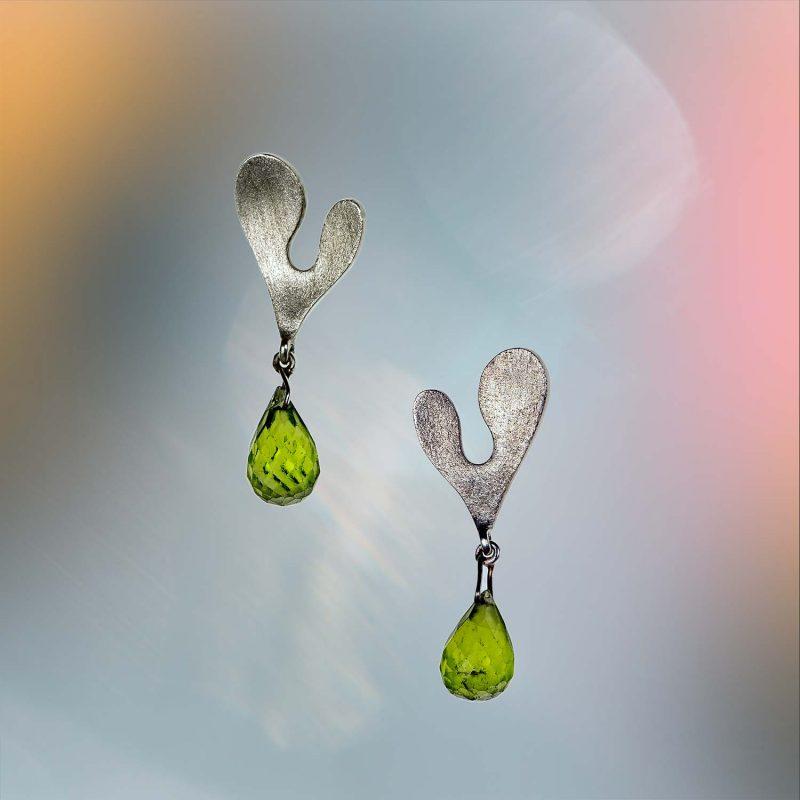 Heart-shaped earrings inspired by an odyssey across the south seas. Crafted in silver with peridot briolette drops.