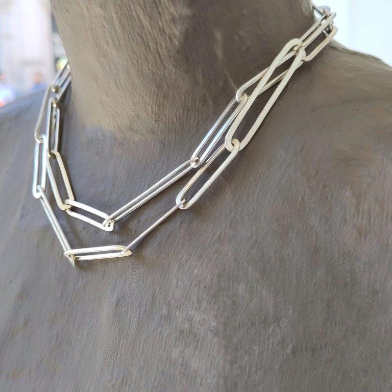 Each link in this metre-long necklace is individually hand-forged in silver so every necklace is slightly different. Made from medium and long links, this has become one of our signature handmade pieces – it looks great with whatever you’re wearing, relaxed in summer, classic in winter and beautifully tactile.