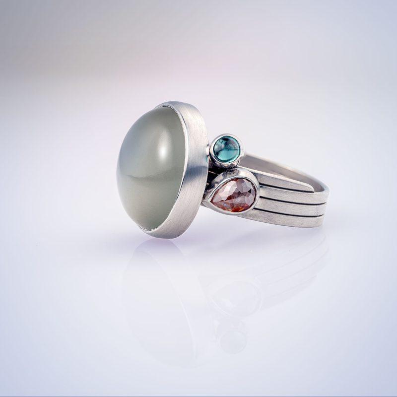 A very special one-off Ribbon ring made with rare Fairtrade and Fairmined platinum. Like the moon, the centre moonstone suggests both warm and cool tones, offset with an orange pear-shaped diamond and green tourmaline for a flash of colour.