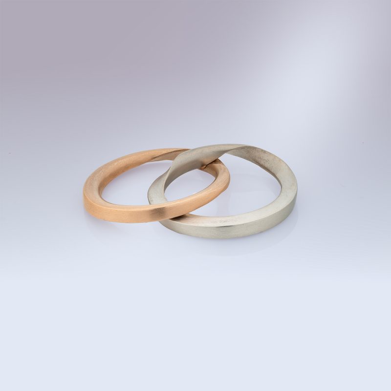 A modern interpretation of the medieval gimmel ring, created from two entwined elements that fit together to become one. When together, your engraved message lies hidden in the heart of the ring.